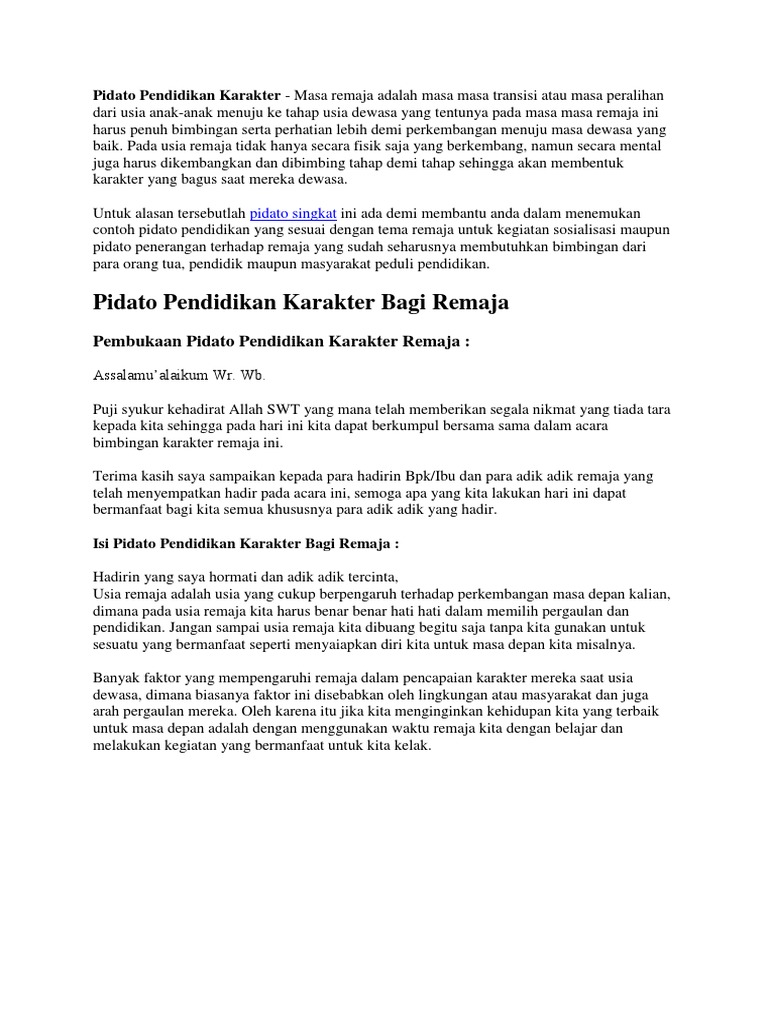 Puji syukur kehadirat tuhan yang maha esa yang telah memberikan segala rahmat dan nikmatnya kepada kita semua sehingga kita bisa berkumpul dalam keadaan yang sehat dalam acara bimbingan karakter remaja ini. Contoh pidato singkat tentang pendidikan pendidikan merupakan suatu kebutuhan pokok untuk seluruh manusia entah itu pendidikan formal maupun nonformal. Contoh pidato singkat tentang pendidikan berkarakter moral assalamualaikum wr.