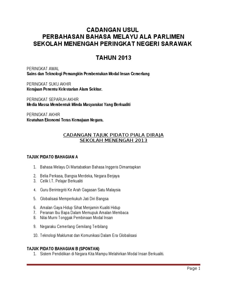 Contoh pidato bahasa melayu sekolah menengah. Oleh itu bahasa melayu perlu dimartabatkan untuk menjadikannya lebih berkualiti dan mampu bersaing dengan bahasa bahasa lain di dunia. Malaysia di pentas dunia begitulah murninya mauduk pidato yang akan saya hidangkan kepada hadirin untuk menjadi santapan minda di pagi yang gemilang ini. Pertandingan pidato bahasa melayu sekolah menengah by seseriibowls in types school work.