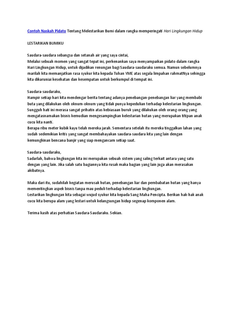 Contoh pidato peduli lingkungan panjang. Ulasan teks pidato singkat 1. Sekarang lihat yukk contoh pidato tentang. Kebersihan lingkungan assalamualaikum wrwb yang terhormat bapak kepala sekolah sma negeri 5 surakarta yang saya hormati bapak ibu guru dan karyawan sma negeri 5 surakarta dan teman teman semua yang saya cintai.